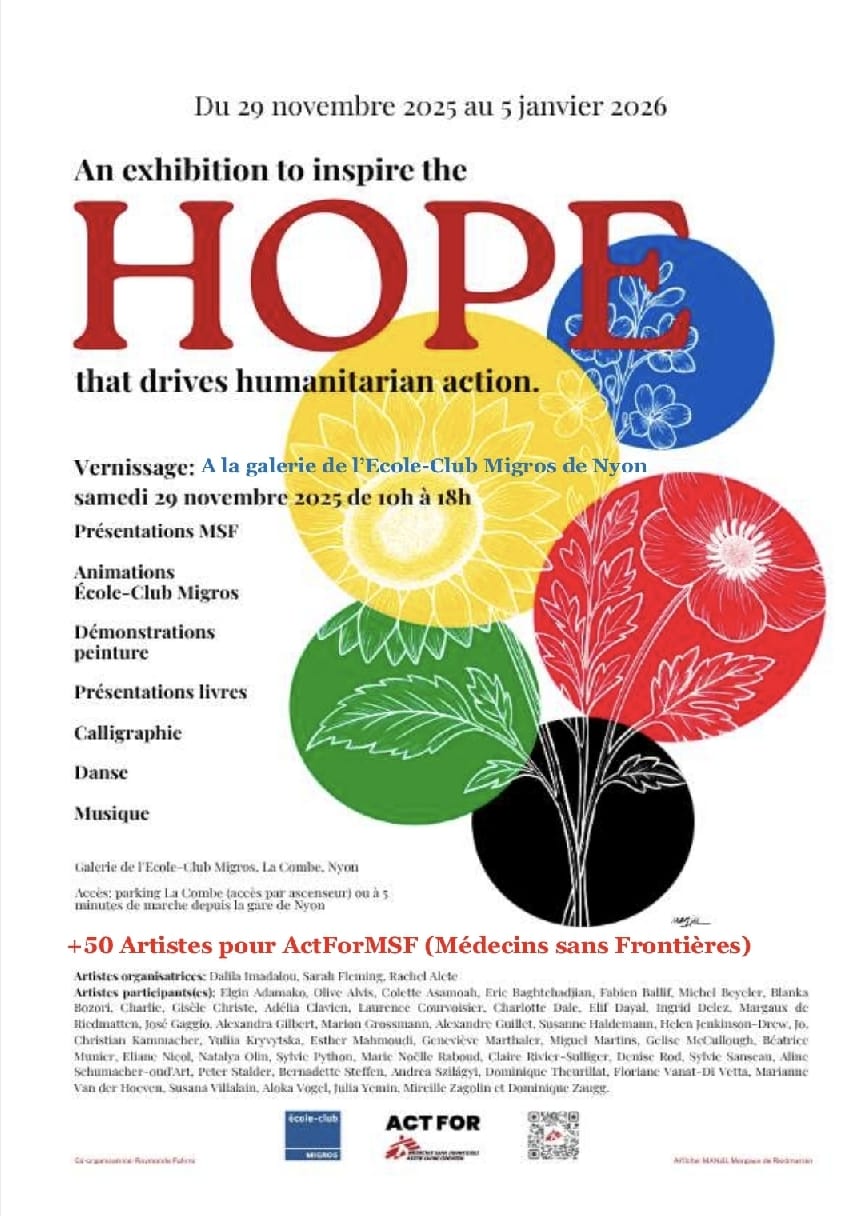 Au château de la Sarraz avec le peintre Pietro Tignonsini / 2. A Rolle sur les quais exposition en plein-air, 30 œuvres au format mondial sur la ville de Rolle / 3.A Aubonne à la salle polyvalente avec l’aide de Resoart (Exposition collective) / 4. Au MAG (Montreux Art Gallery, sur invitation) exposition d’une dizaine d’oeuvre et d’une vidéo de 20 minutes 25 œuvres sur les Biennales de Montreux