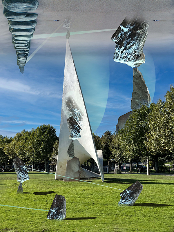 Une Gaggiographie d’une photo prise sur la plage de Pully et une sculpture équilibriste de l’artiste Jean-Paul Gobet.
