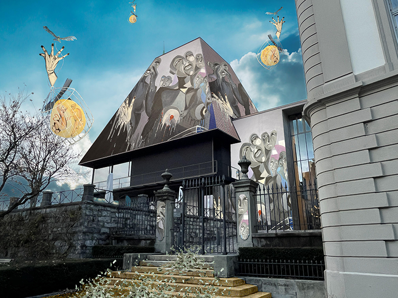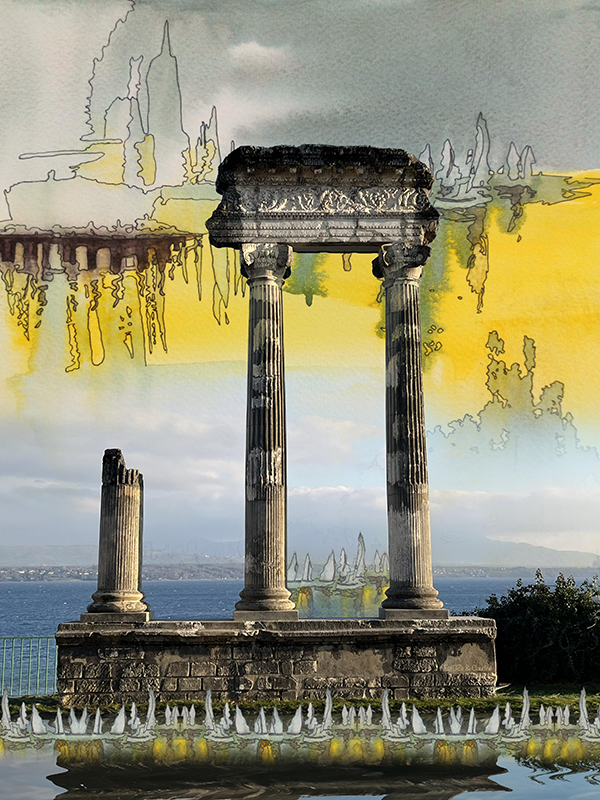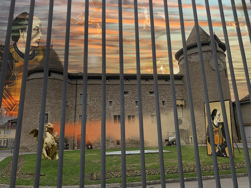 Une Gaggiographie d’une photo prise à l’arrière des grilles du château de Morges et l’oeuvre de Marie-Christine Czura Sarbach
