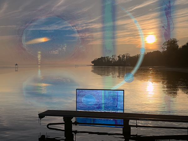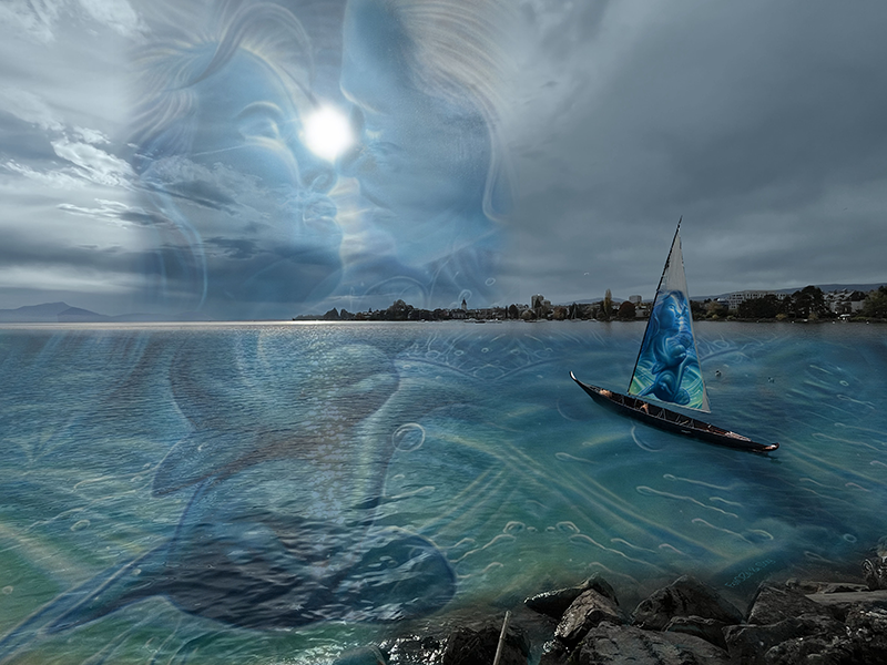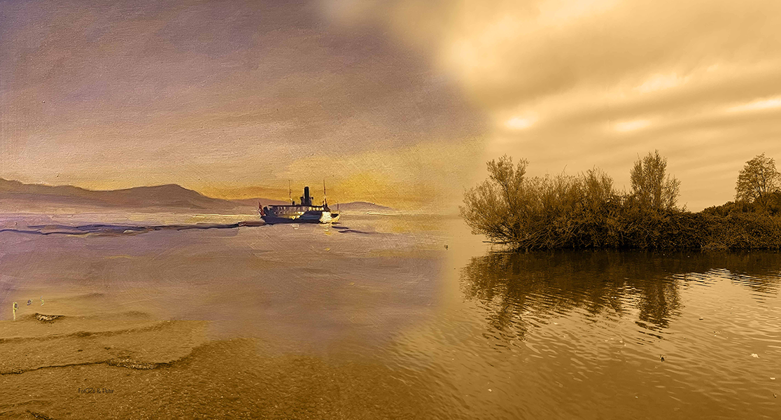 Une Gaggiographie d’une photo prise dans la baie de St-Prex un couché de soleil particulier avec un reflet orange dans le ciel et l’intégration de l’oeuvre de Anna Krauss Zemp